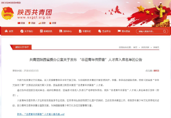 “非遗青年传薪者”人才库由共青团陕西省委设立,旨在凝聚青年非遗人才,为非遗保护、传播与传承储备骨干力量,助力中华文脉青春传承。