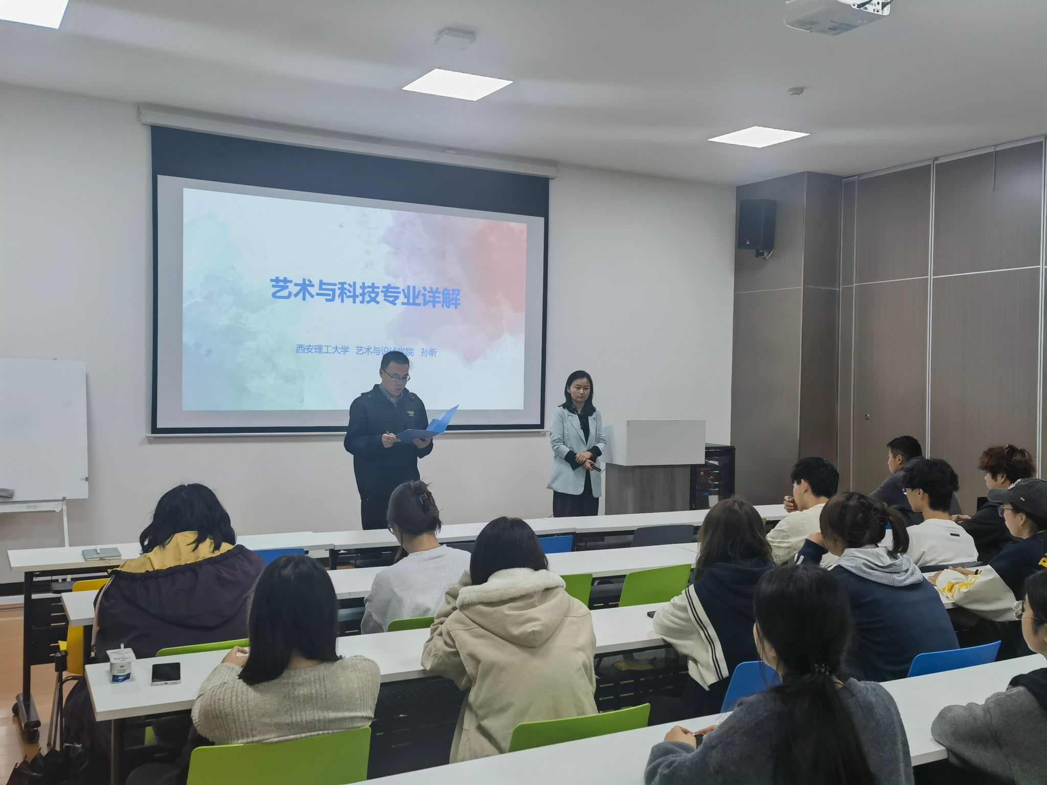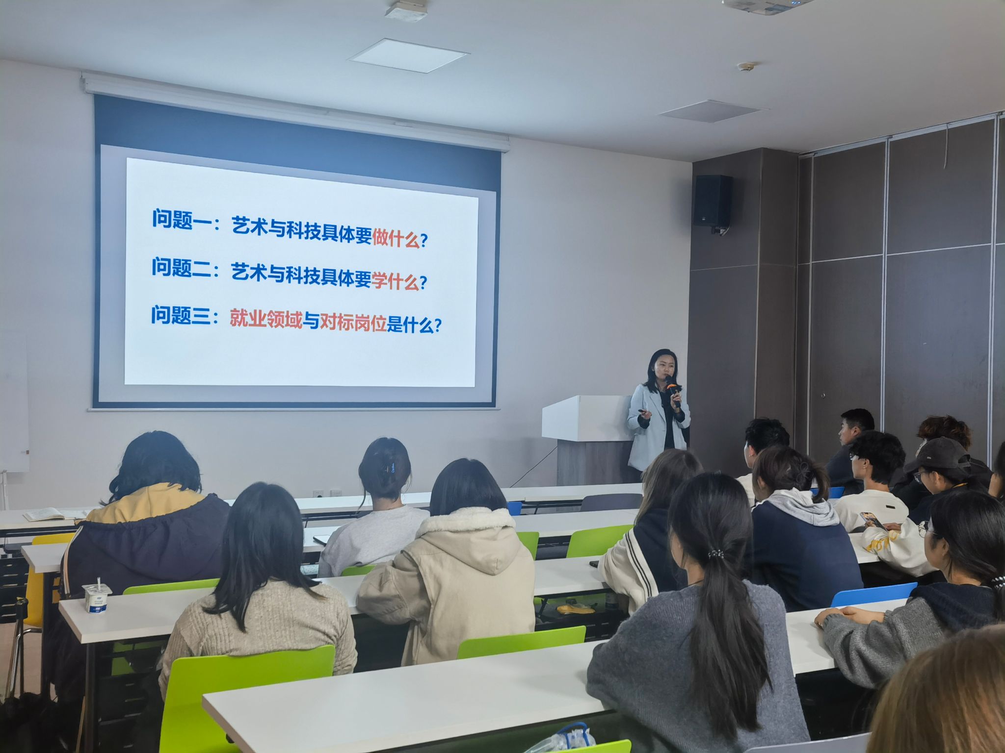 为帮助 2025 级新生快速融入专业学习、找准成长坐标,进一步明晰艺术与科技专业学习方向与发展前景,点燃专业探索热情。艺术与设计学院于10月16日晚,在曲江校区就业发布大厅面向艺术与科技专业新生举办了第三期“立艺讲堂”专业教育活动。活动由环境设计系主任孙昕副教授主讲,2024级辅导员郑昊参加。