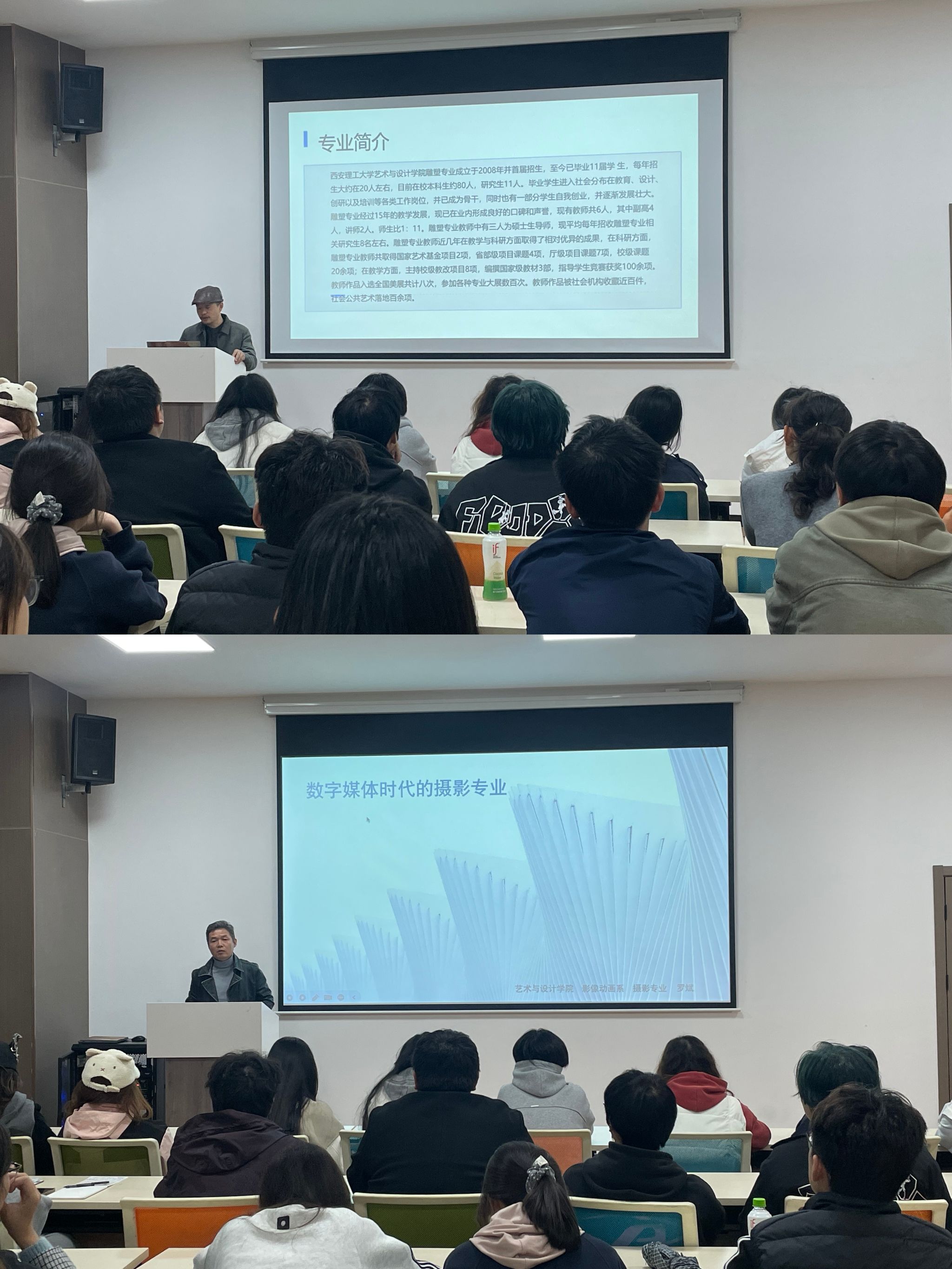 接下来,罗斌为同学们讲解了摄影专业的发展现状,从课程设置、教学内容、学校相关教学资源等方面作了细致梳理。同时分享了毕业生就业前景等方面的具体情况,为学生拓宽了专业认知视野。