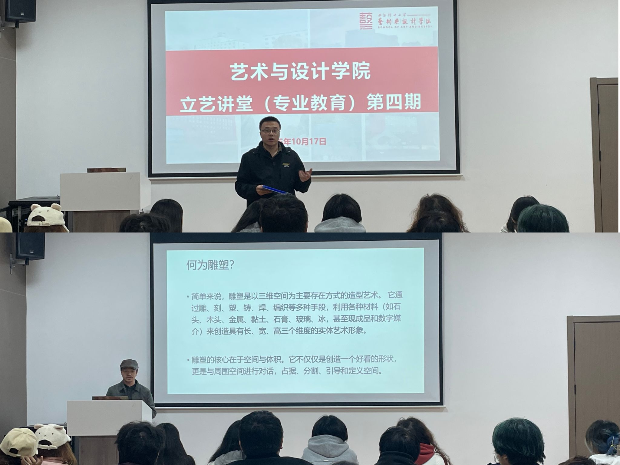 为帮助2025级新生筑牢专业基础、明晰发展方向、增强专业认同,艺术与设计学院于2025年10月17日中午,在曲江校区就业发布大厅面向全体美术学专业新生举办了第四期“立艺讲堂”专业教育活动。本期讲座特邀雕塑专业负责人宋明明副教授、摄影专业负责人罗斌,担任主讲。